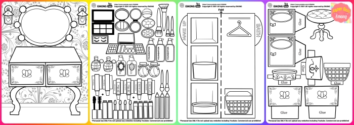 I planned a series of making a paper doll house. Making cosmetics is the first video of this plan. All of the designs for this series have been drawn, but have not yet been filmed or edited. I will upload the next video soon. I will share my unpainted drawings on this site. You can color and decorate with your own feelings. Enjoy it.